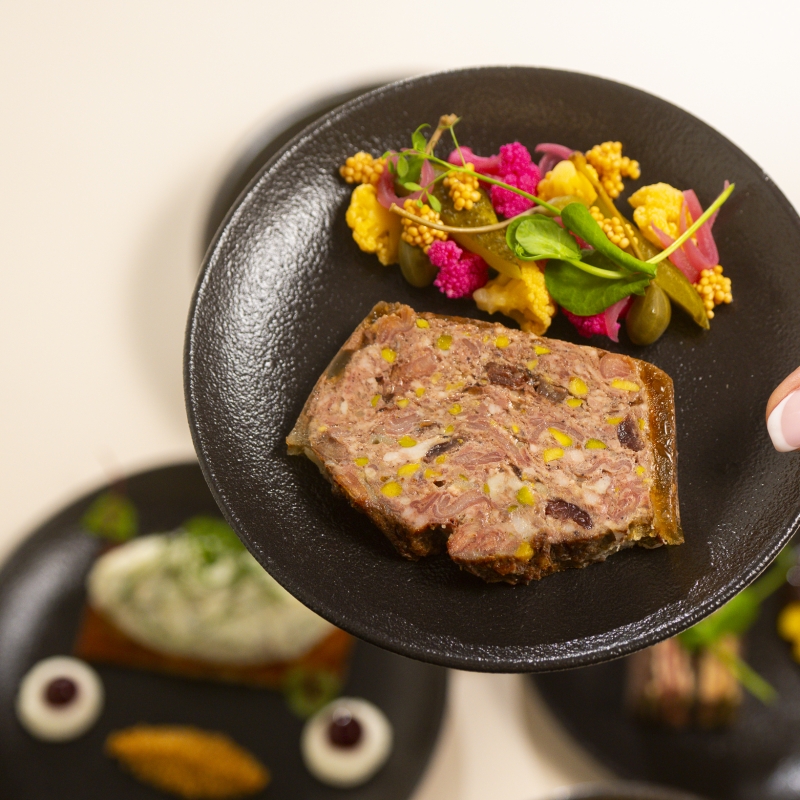 Plateau repas A Entrée : Terrine de lapin pistache et cranb